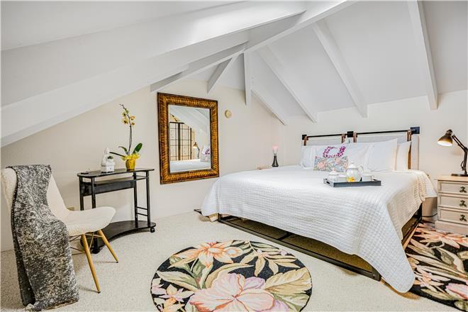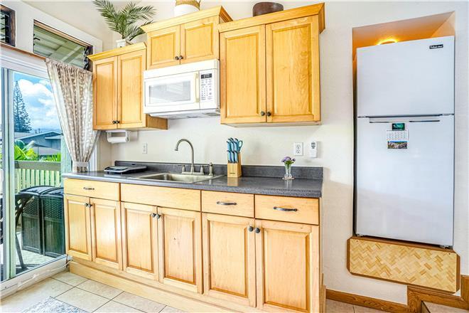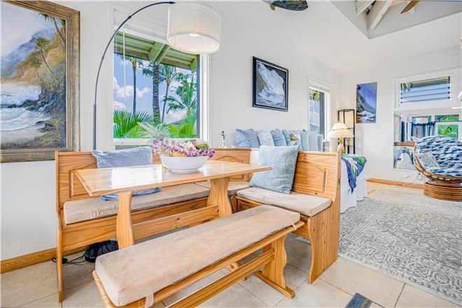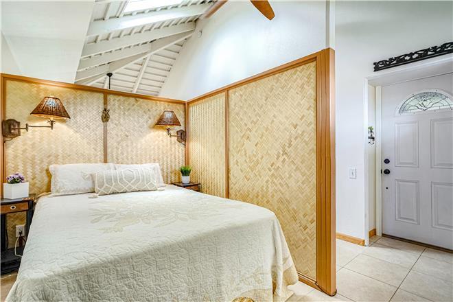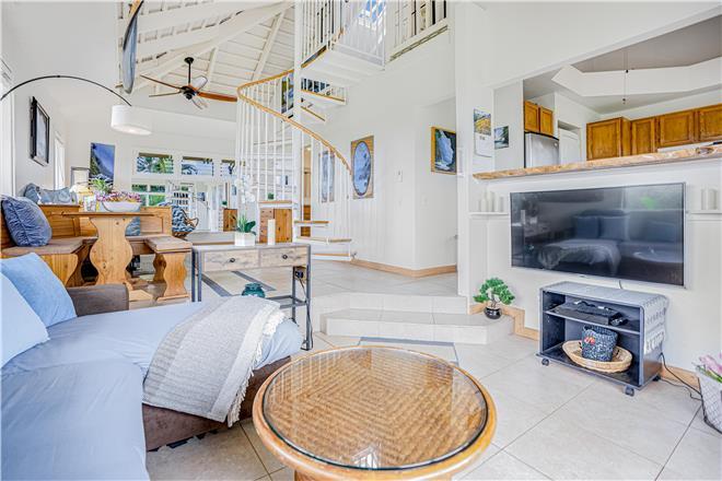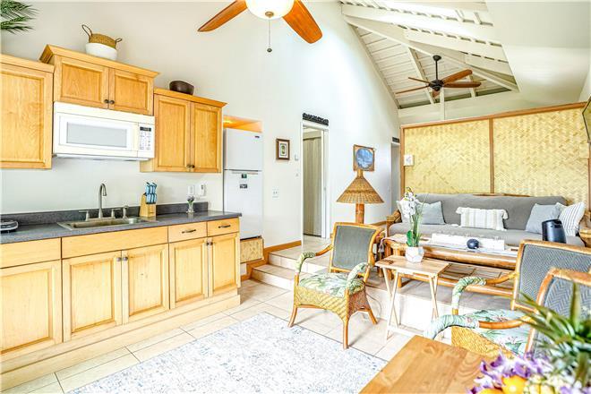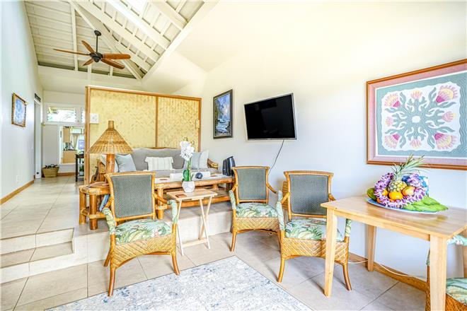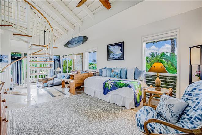 The loft style studio A features an open floor plan adorned with original art by talented North Shore artists, including some unique surfboard and mat pieces. A large, spiral staircase leads to a stand-up bedroom space with a venting skylight to see the stars at night or listen to the sounds of the winter North Shore waves crashing on the reef. Privacy screens add extra division between household living and bedroom spaces. The full kitchen comes equipped with all major appliances, including a dishwasher, making at-home meal planning a breeze. After you've had your fill of sun, unwind before bed with your favorite shows or a movie on the living room smart TV.