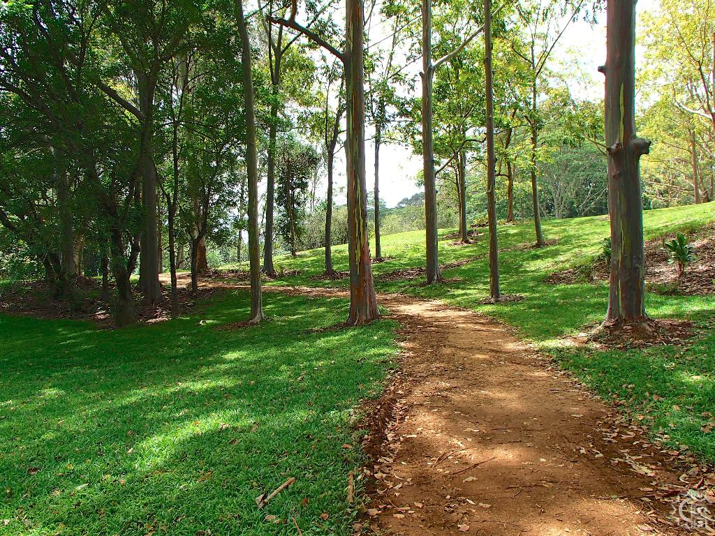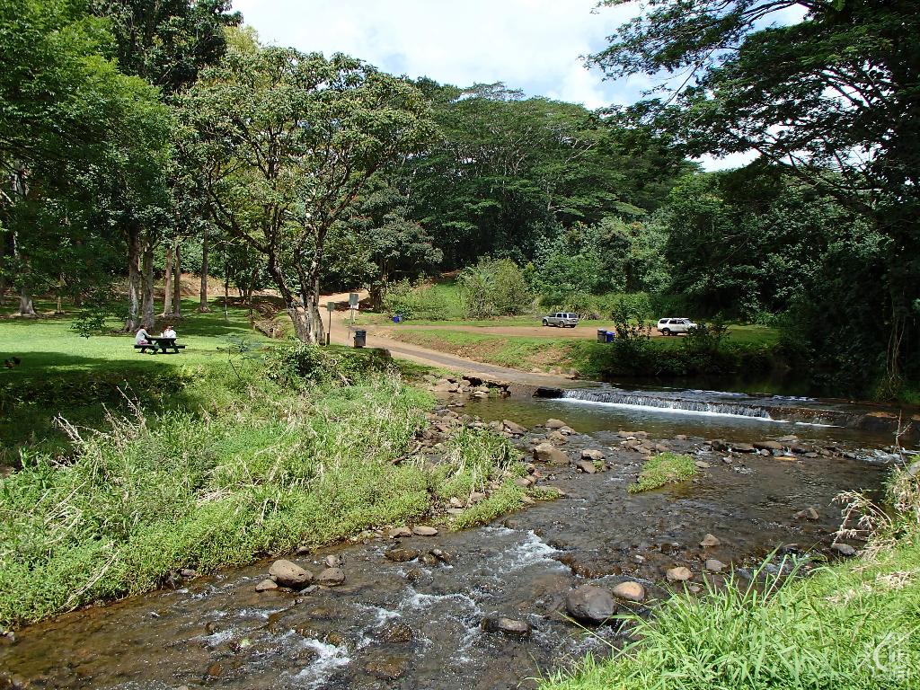 Once you have parked, cross the stream on foot, and look for a path on the left through the towering Rainbow Eucalyptus. Follow the path as it winds uphill and you will see a picnic shelter to the right. A looping trail begins just below the shelter on the left, and it runs a circle for about 0.5 miles. Utilize the picnic pavilions or take a fresh water stream swim to relax and enjoy this Kauai quiet spot.