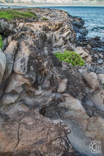 During the time period of ancient Hawaii when the Maui Volcano was active, molten lava from the volcano flowed freely into the ocean where it was pushed back by strong ocean currents and winds. After being forced back ashore, it cooled into the stunning formations of Dragon's Teeth (also called Makaluapuna Point.) This was one of the last lava flows on the island, adding to the uniqueness of the sight. The frequent spray of salt water over the rocks over the years has bleached the color of the lava, so the originally black "dragon's teeth" are now white.