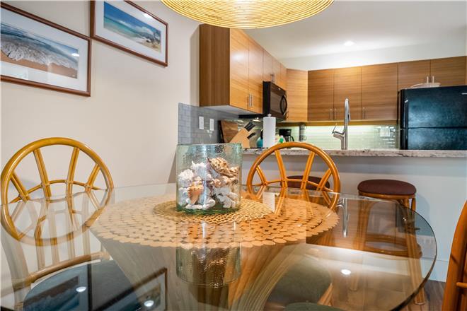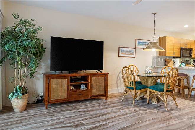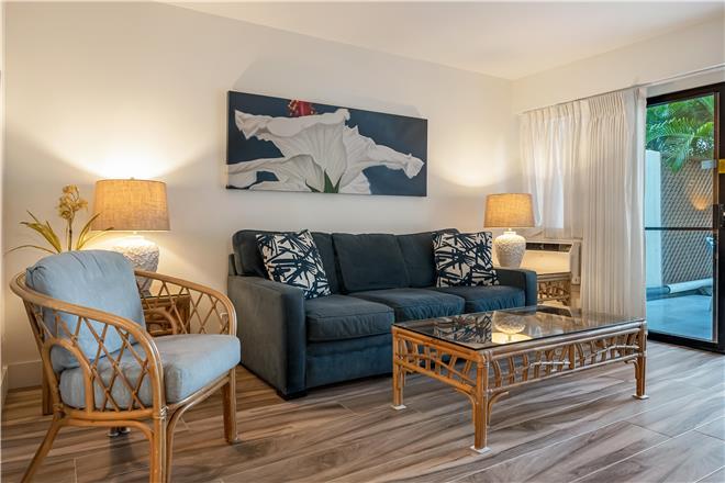 Relax in the living area appointed with a sofa bed and a smart TV doors open to the lanai. Whip up tasty meals and beach snacks in the kitchen, equipped with a full suite of appliances. Eat together at the table and sip morning coffee at the breakfast bar.