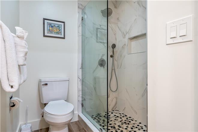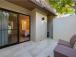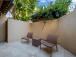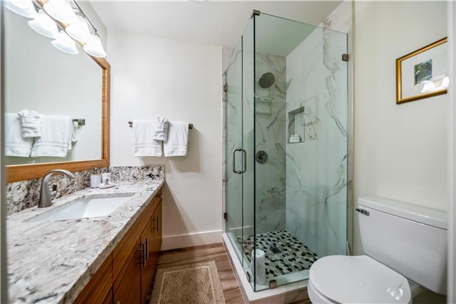 The bedroom offers a TV and an en suite bathroom. The room opens to a private walled patio the perfect place for a crisp afternoon beverage.