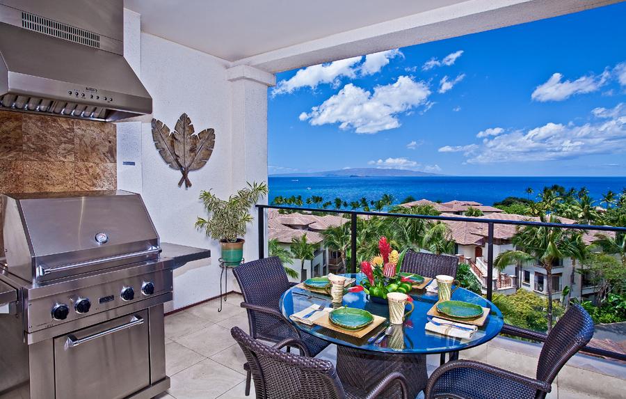 Tax ID: #TA-162-572-9024-01Situated in the centrally located "Penthouse" building on the 4th floor in a west-facing ocean view corner location with breathtakingly beautiful panoramic ocean and sunset views, this 2.5 bedroom (king bed in each bedroom plus 2 twin beds the enclose-able den that can be converted into a king bed) was just beautifully redecorated with stylish furniture from Serena and Lily in calming hues of of blues and whites. There are two bathrooms, a private veranda with a built-in Viking gas grill, a dedicated elevator, and a lovely view to the family pool and hot tub spa below. The living room has an extra side window which allows much more light to flow in for a cheerful, sun-splashed ambiance. The serene interior is decorated with quality furnishings and bed covers in light soft palettes. This is one of the best ocean views at Wailea Beach Villas!
