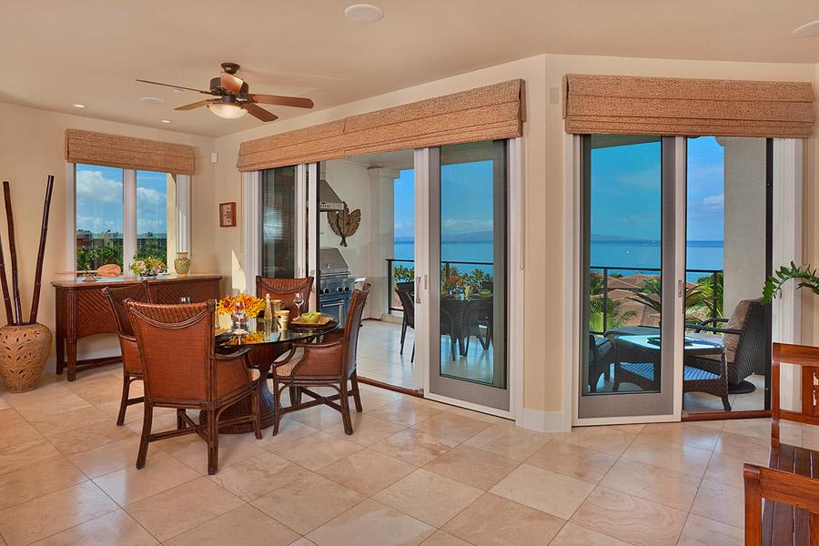 Ride your very own dedicated elevator up four stories to a prime elevation set above the family pool and spa, as well as the residents-only gym. At this elevation, guests are privileged with unequaled panoramic views of Wailea Beach, the Four Seasons and Grand Wailea Resorts, and westward towards the sparkling blue Pacific. Facing the ocean, floor to ceiling solid glass doors and screen doors retract for an open-air living experience. This previously undiscovered vista is simply impossible to capture in photographs. With confidence we can boast that you likely may not want to go anywhere during your holiday, if other than to lounge day and night on the ocean view private terrace, from where you can whale watch during winter season, star gaze at night, and otherwise be entertained by mother nature's soul-stirring and ever-changing hues of blue in both sea and sky.
