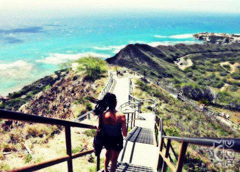 This is a very popular hike on the oceanfront just east of Waikiki and in Honolulu. The trail is not very long at 1.6 miles round trip, however the arid exposed conditions and the 560 foot gain of elevation makes this quite a workout. The reward for those reaching the summit is a panoramic view of the beaches of Waikiki and Honolulu town stretching all the way to the greenery of the central Ko'olau Mountains.