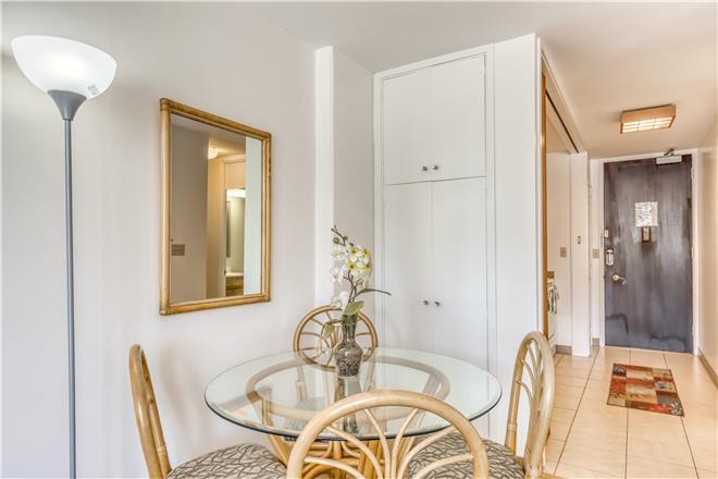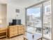 This studio is welllit and inviting, with a back wall of glass that frames a view of the surrounding city. Theres central air conditioning to keep you comfortable, as well as a fully appointed kitchen to greet you as you walk through the front door. Sit down at the circular glass table to enjoy a homemade meal, finish a crossword, or use the highspeed WiFi to catch up on a bit of work from home. At night, you can kick back on the sofa with a view of the flatscreen cable TV as the days swimsuits and towels spin in the shared laundry facilities just down the hall.