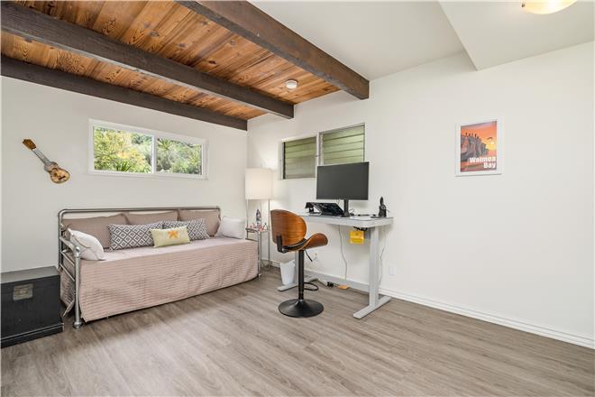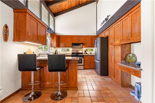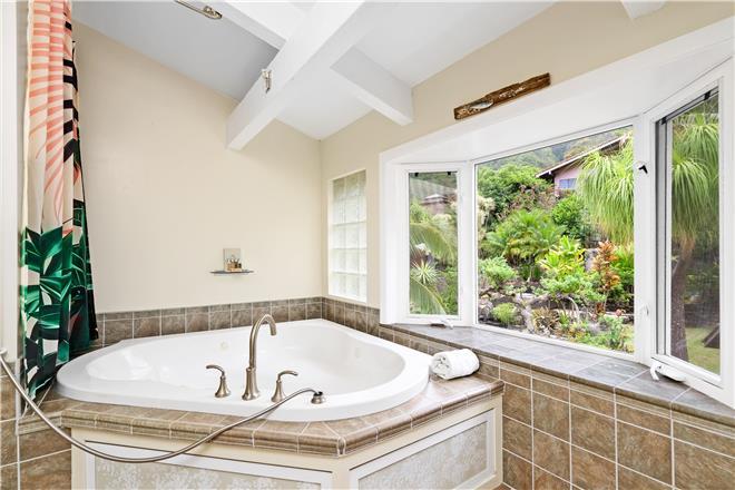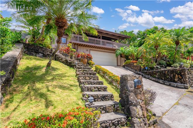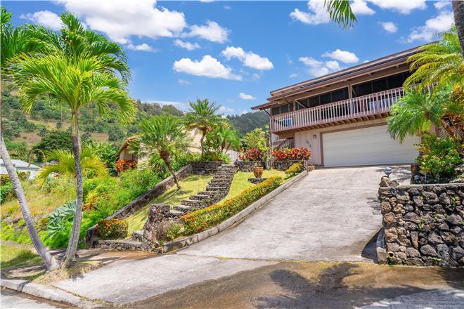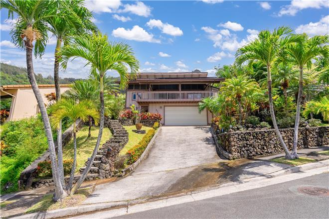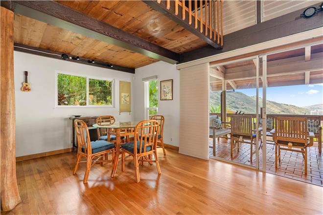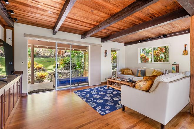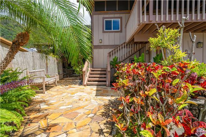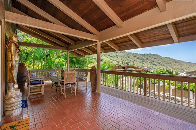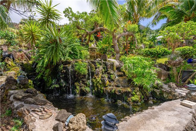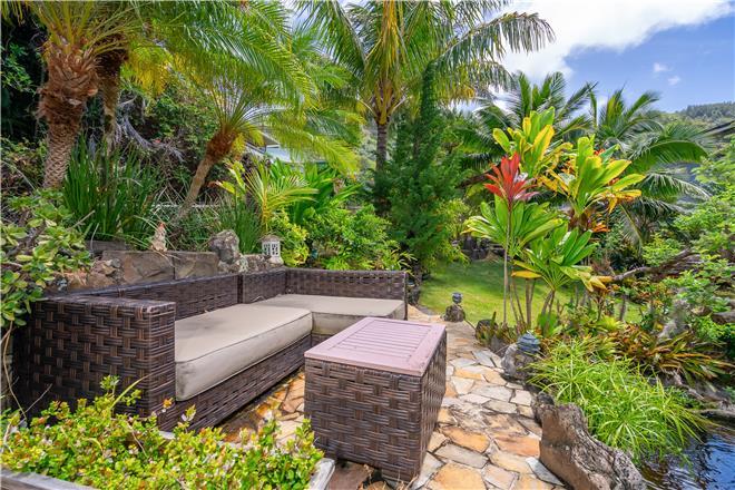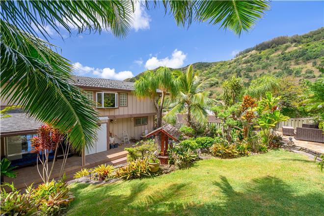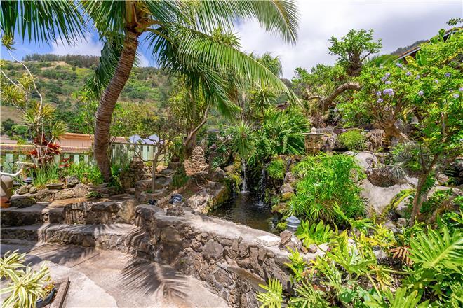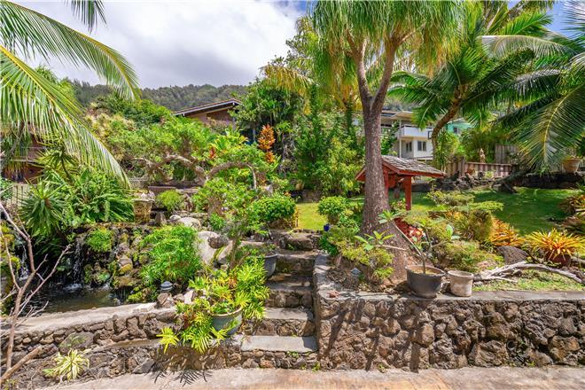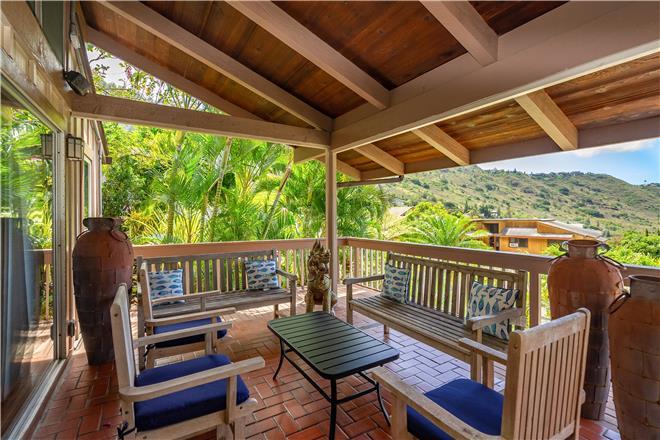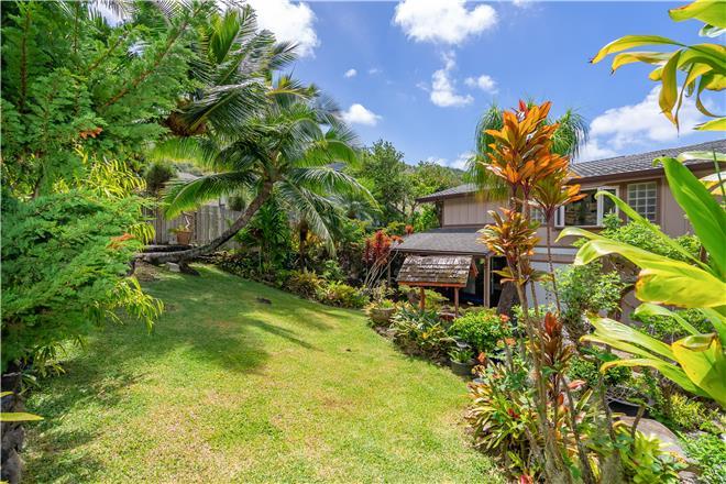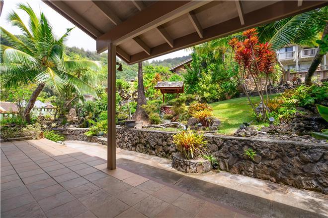 Youre sure to find your zen at this slice of paradise. From a gorgeous lanai to a lush garden, this stunning home offers exceptional outdoor space. Follow the charming stone path to the tropical backyard and spend afternoons reading or simply relaxing to the soothing sounds of the trickling koi pond. Large sliding glass doors open from the living area to a large covered lanai that showcases beautiful views of the rolling mountains and the ocean in the distance.