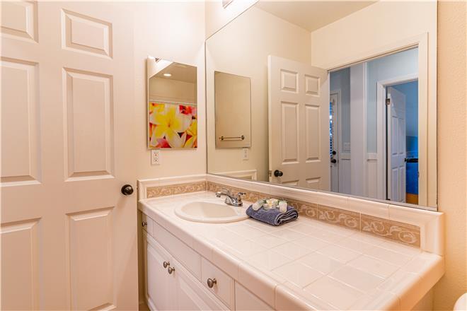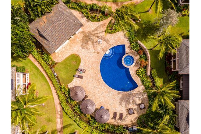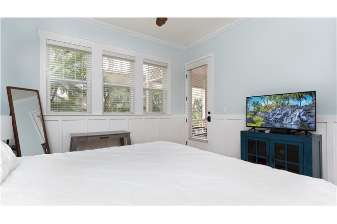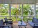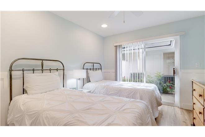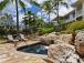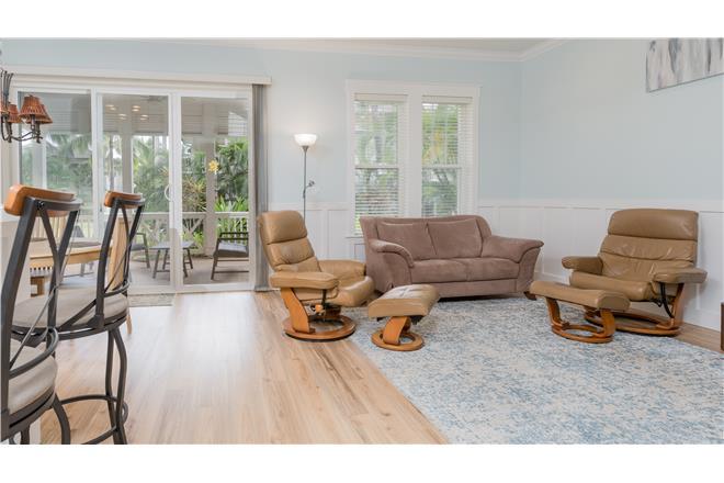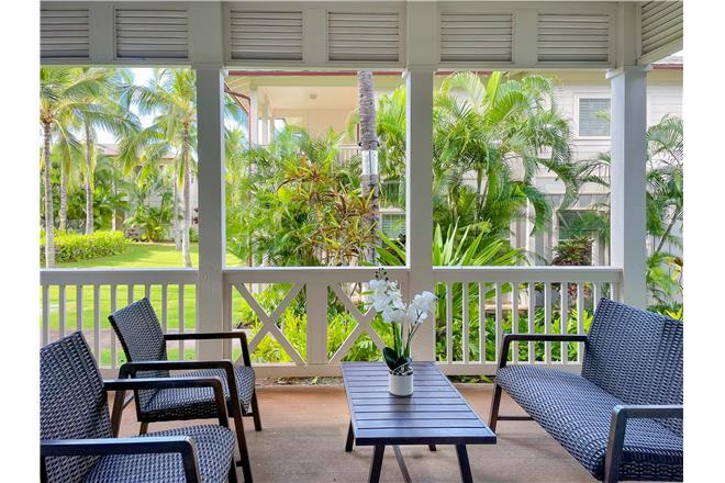 Experience tranquility on the airy and open lanai. Encircled by verdant vegetation and the sweet scent of plumeria trees, this private sanctuary features deep seating lounge furniture and a ceiling fan, crafting a perfect spot for unwinding or intimate conversations.