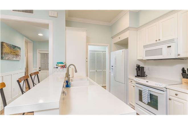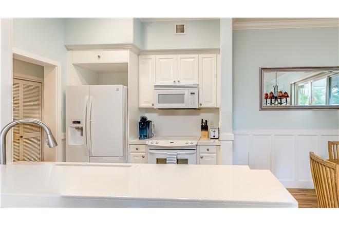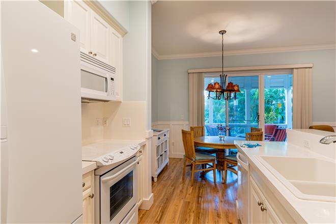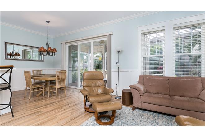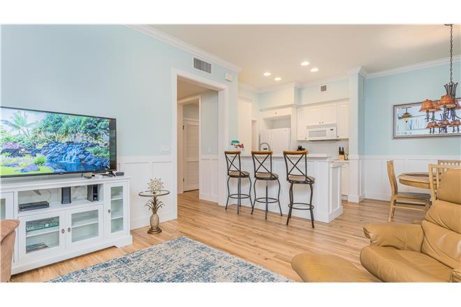 Step into a freshly updated space where contemporary wood plank flooring harmonizes with the tropical outdoor surroundings. The heart of this home, a fully upgraded kitchen, shines with new appliances and eye-catching gray, white, and silver natural quartz countertops, creating an inviting space for culinary creativity and social gatherings.